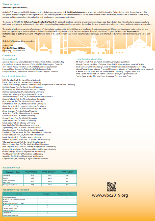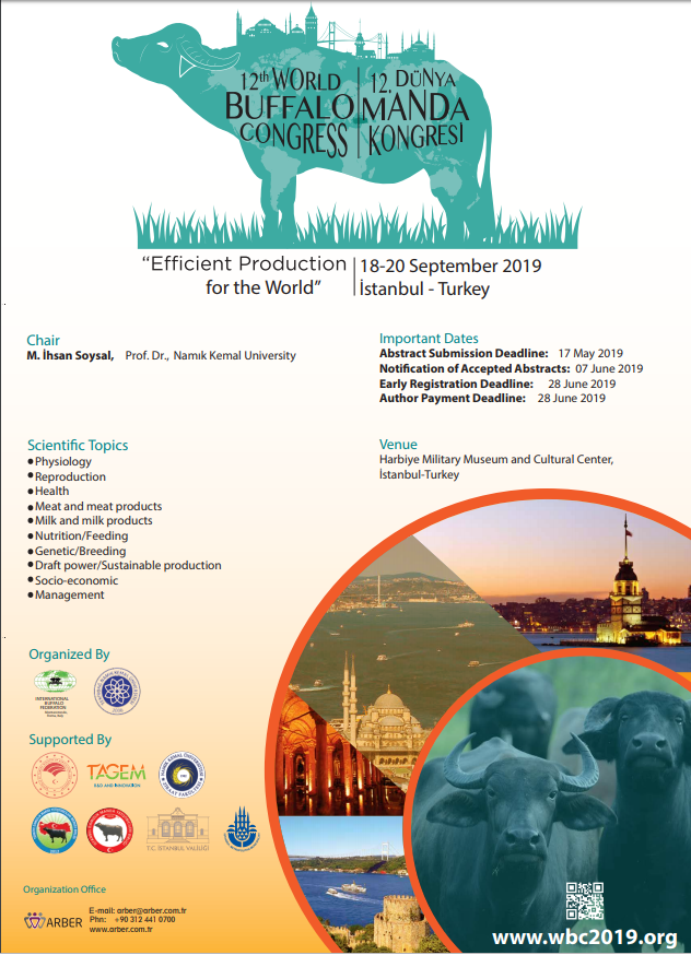 Sevgili Meslektaşlarım ve Arkadaşlarım, Uluslararası Manda Federasyonu adına sizleri içtenlikle, 18-20 Eylül 2019 tarihleri arasında İstanbul’da düzenlenecek olan 12. Dünya Manda Kongresi’ne davet ediyorum. Kongrenin Doğu ile Batı ve Kuzey ile Güney arasında bir köprü sağlayarak manda üretimi, araştırma ve bilim toplulukları, ulusal ve uluslararası düzenleyici kurumlar, politika belirleyiciler ve tüketici kuruluşlar ile birlikte önemli konuları ele alması beklenmektedir. WBC2019 teması “Dünya İçin Verimli Üretim”dir”. Küresel ısınmanın, çevresel ve ekolojik bozulmanın, doğal kaynakların tükenmesinin, doğal ve insan kaynaklı tehlikelerin ve ekonomik krizlerin üretim yöntemlerimizi ve tüketimimizi etkilediğine, üretim sistemlerinde ve organizasyonlarda ve davranışlarımızda yeni stratejiler gerektirdiğine inanıyoruz. İstanbul, Doğu ile Batı ve Kuzey ile Güney için farklı kıtaların ve kültürlerin kavşağı olarak bir buluşma noktası olma rolünü yansıtacak şekilde seçilmiştir. Ayrıca, İstanbul ve Türkiye’de birçok tarihi yeri ziyaret etme fırsatına sahip olacaksınız. Ana kongreye ek olarak, 16-17 Eylül 2019 tarihleri arasında “Mandada Üreme Biyoteknolojisi” konulu kongre öncesi çalıştay yapılacaktır. Geleneksel Türk misafirperverliği ruhu içinde sizleri İstanbul’da ağırlamayı umuyor ve sizlere verimli bir toplantı, keyifli bir konaklama diliyorum. Organizasyon Komitesi adına, İyi dileklerimle, Prof. Dr. M. İhsan SOYSAL Organizasyon Komitesi Başkanı