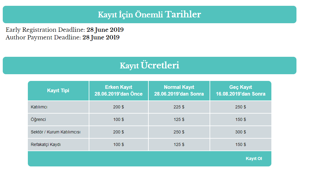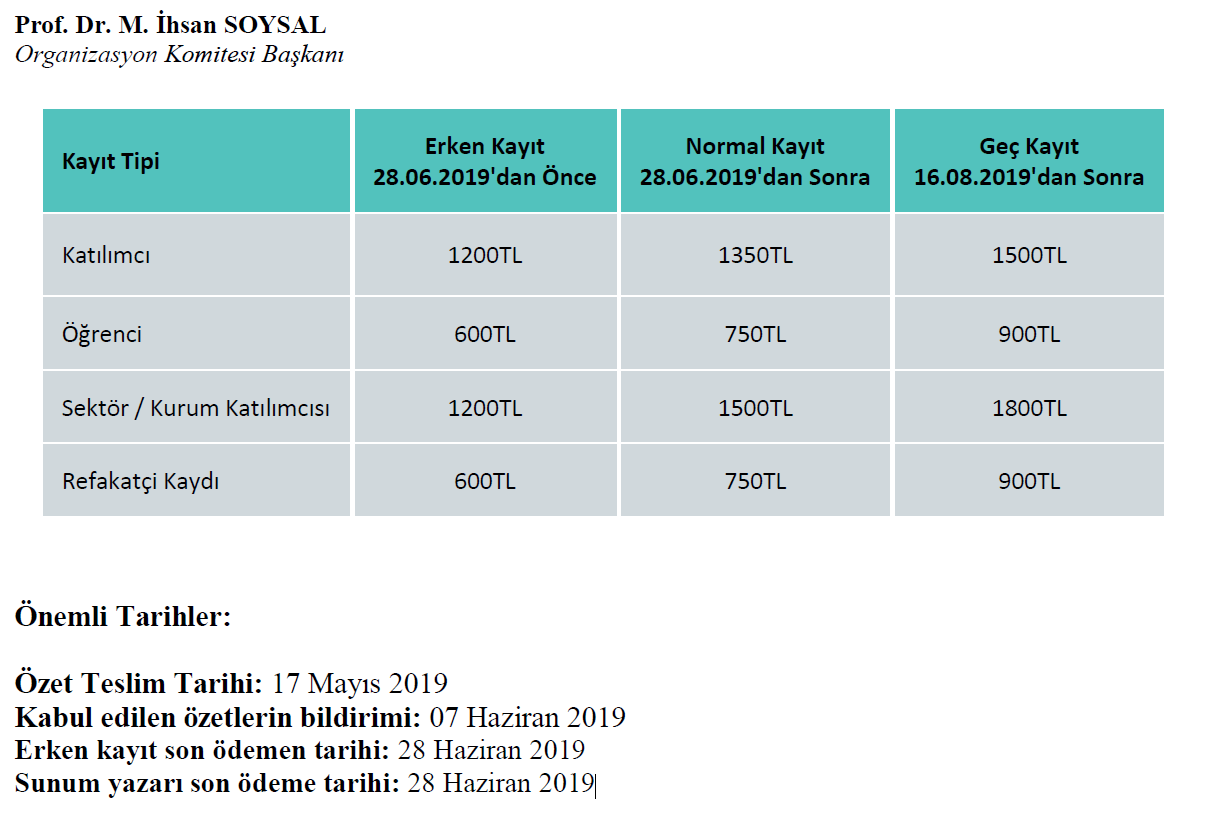 Önemli Tarihler: Özet Teslim Tarihi: 17 Mayıs 2019 Kabul edilen özetlerin bildirimi: 07 Haziran 2019 Erken kayıt son ödemen tarihi: 28 Haziran 2019 Sunum yazarı son ödeme tarihi: 28 Haziran 2019